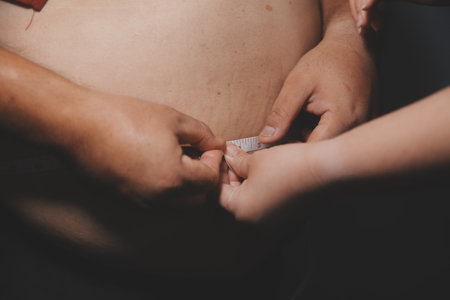 Doctor taking patient's body fat measurements with fat caliper