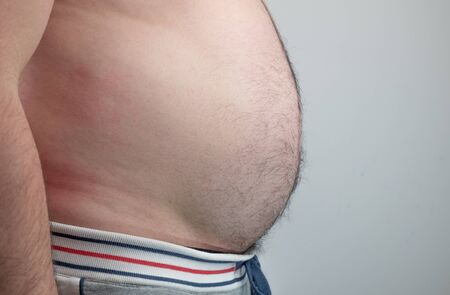 Close up of an obese mans overweight tummy. Unhealthy waistline