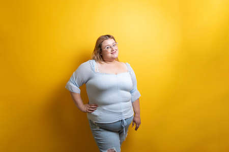 Overweight woman on color background, closeup