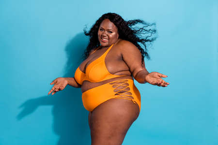 Profile side view portrait of attractive cheerful hot thick woman posing enjoying hair flying isolated over bright blue color background