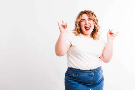 Beautiful fat young woman with bright emotions on a light gray background. Concept of diet. Space for text.