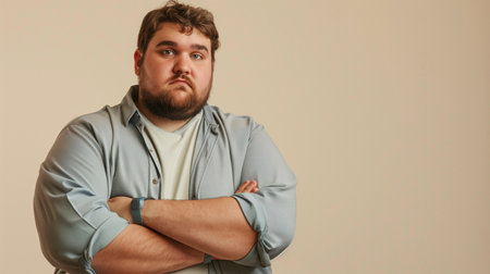 Portrait of a sad plus-size man in casual clothes with crossed arms, studio shot against a beige background.