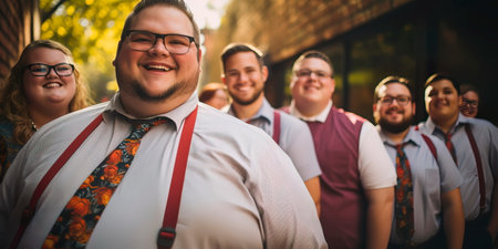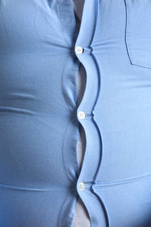 Close up view of overweight man in tight shirt as background