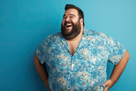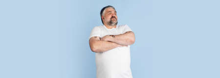 Handsome caucasian plus size male model isolated on blue studio background. Concept of inclusion, human emotions, facial expression