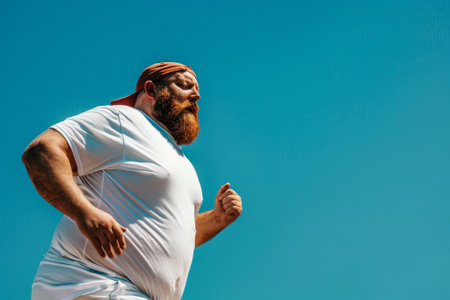 fat man with big belly and tattoes in sports wear is holding his stomach with shocked emotion