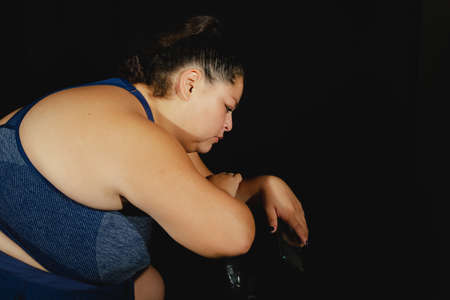 Overweight woman in sportswear on black background