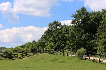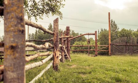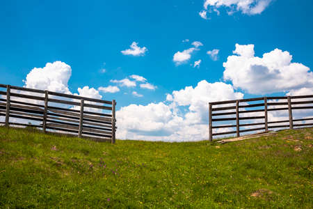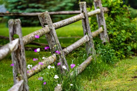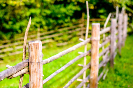 Very old wooden corral fence at summertime rural scene. Shallow depth of field