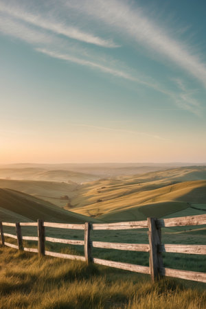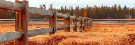 A serene dry grass field showcases golden grasses swaying gently in breeze, framed by rustic wooden fence. peaceful landscape evokes sense of tranquility and natural beauty