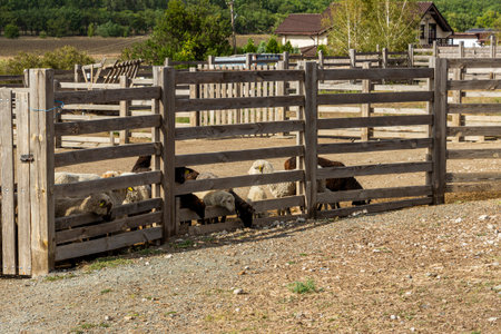 goats and sheep behind wooden fence, looking, white black muzzles, hairy ears, domestic animal, rough boards, dry land, countryside, summer, farm, domestic, animal care