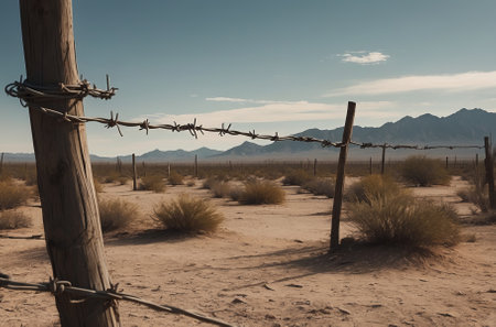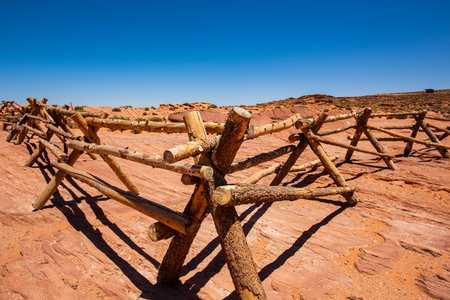 Wood logs fence mark boundaries in a desert landscape, blue sky with clouds. Sunny spring day in Western American countryside, USA