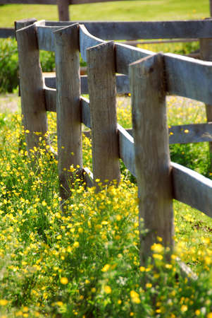 Weeds and yellow flowers growing on a wooden fence in a meadow on a farm.