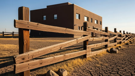 A rustic wooden fence stretches across an open field under a clear blue sky at sunrise, casting long shadows and highlighting the tranquil rural scenery.