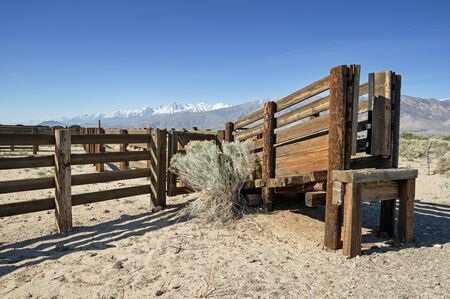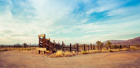 Panorama of an old western corral in the desert of Arizona in late afternoon light.