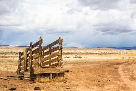 An old corral, abandoned in the desert of Arizona under a blue sky with bright white clouds on a spring day.
