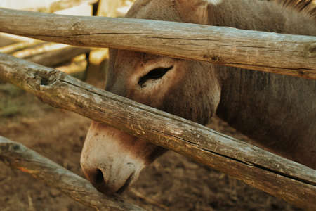 A donkey on a farm, a beautiful photo of a donkey living on the street in a village. Contact zoo, farm.