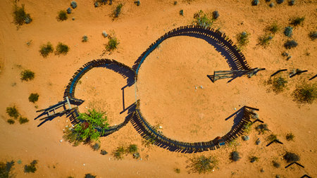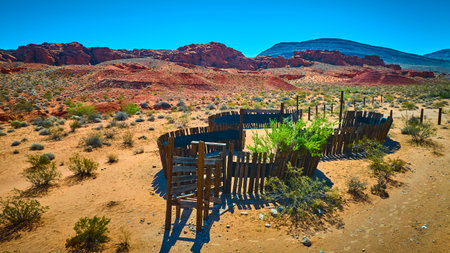 Aerial Old Wooden Corral and Red Rock Desert Landscape Nevada