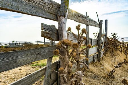 Dry Brown Burdock (Spine) grows near a rural wooden old fence. sunny summer day, blue sky on the background. Prickly Plant
