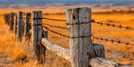 Sunlit Countryside Close Up of Wooden Fence Posts and Wire in Golden Field at Sunset