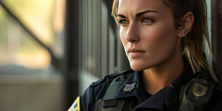 Close up image of a police officer in uniform, symbolizing law enforcement, security, and public service.