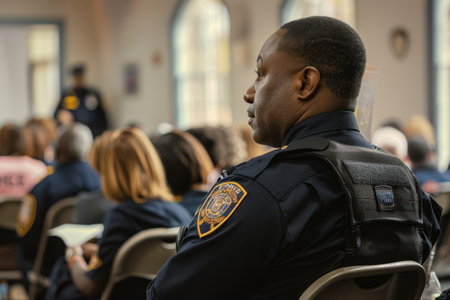 A police officer stands in front of a group of people, addressing issues at a community meeting, A police officer attending a community meeting to address concerns