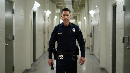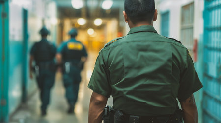 An image featuring a correctional officer in uniform, patrolling or interacting with inmates, highlighting their role in maintaining order and security within the prison. Generative AI