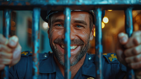 Happy Policeman in prison behind bars. Imprisoned policeman in jail behind bars.
