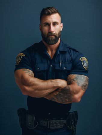 Muscular, tattooed male police officer in uniform, projecting an image of strength, resilience and professionalism