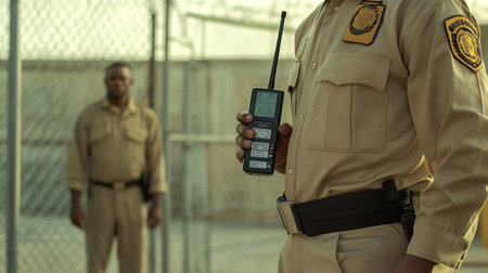 Correctional officer holding walkie talkie monitoring inmate inside prison yard
