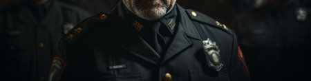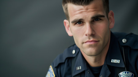 Close up image of a police officer in uniform, symbolizing law enforcement, security, and public service.