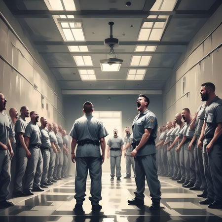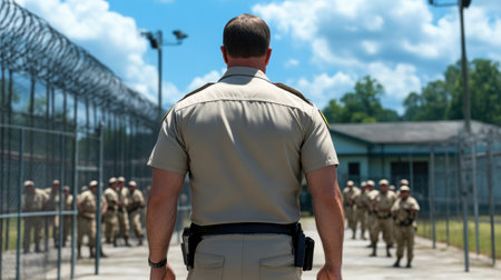 Caucasian female officer stands calmly, observing inmates through a secure barrier at the state penitentiary during her nighttime shift.