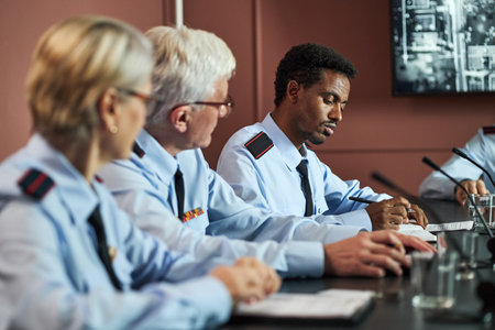 Middle aged Caucasian woman, middle aged Caucasian man, and middle aged Black man sitting at conference table wearing uniforms, discussing documents during political meeting