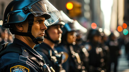 Police squad wearing uniform on the city street. Law enforcement during protests. Created with Generative AI