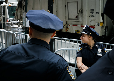 NEW YORK, USA - 01 MAY, 2020: Police officers performing his duties on the streets of Manhattan. New York City Police Department, NYPD