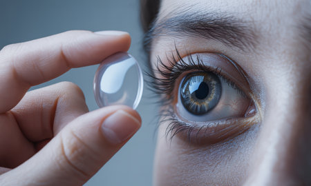Woman eye with a hand holding a clear contact lens, illustrating vision care, ophthalmology, and daily eye health.