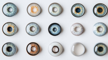 A visually appealing collection of colorful contact lenses arranged neatly on a white background. Ideal for fashion, cosmetic, and retail photography.