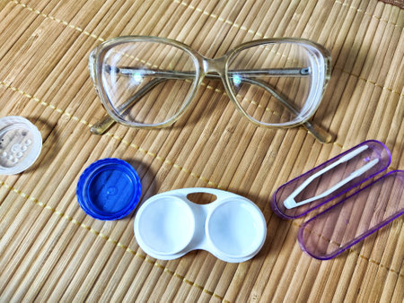 Hand holding an open contact lens case with glasses and lens cases on a surface for an eye care routine.