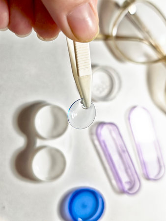 A person uses tweezers to carefully hold a contact lens, surrounded by lens cases and accessories on a clean surface.