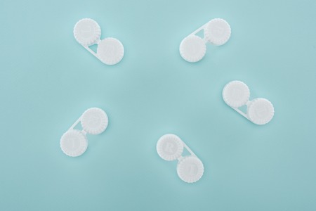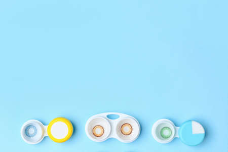 flat lay with contact lenses in containers arranged on blue background