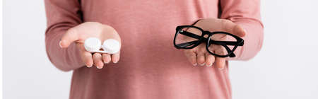 Cropped view of young woman holding box with contacts and eyeglasses isolated on gray, banner