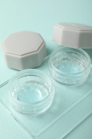 Contact lenses in case on light turquoise background, closeup