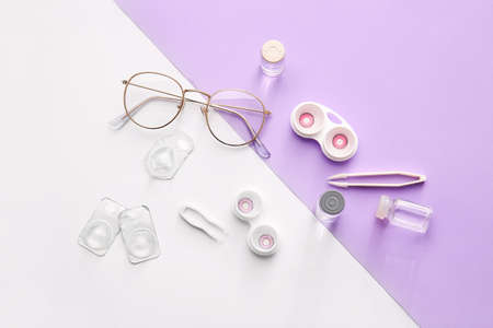 Container with contact lenses, tweezers and eyeglasses on color background