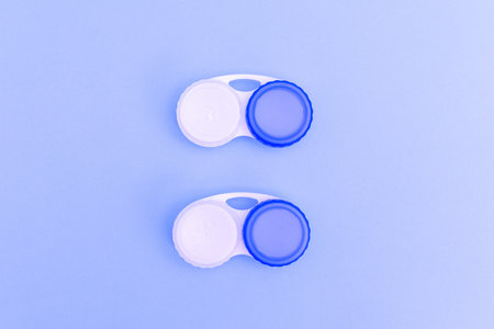 Contact lenses in case on light blue background, closeup