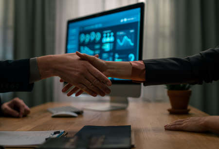 Business partnership meeting concept.photo businessmans handshake. Successful businessmen handshaking after perfect deal.close up,virtual graph chart interface screen