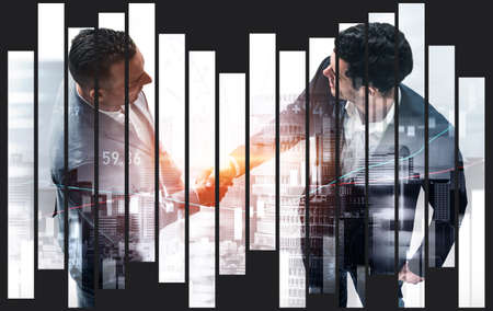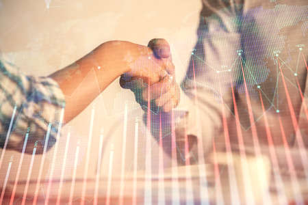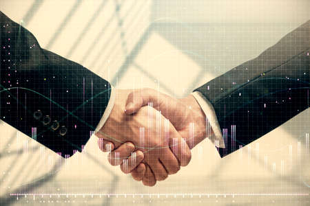 Double exposure of forex graph hologram and handshake of two men. Stock market concept.