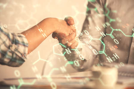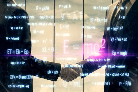 Double exposure of formulas drawings hologram and handshake of two men. Education concept