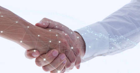 Network of connections over businessman and businesswoman shaking hands against white background. global networking and business technology concept