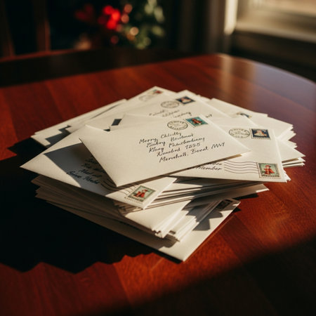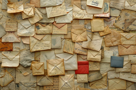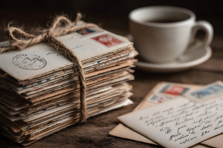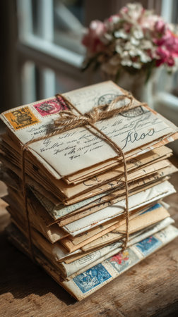 A collection of aged letters rests on a weathered wooden table, showcasing their faded colors and intricate handwriting. An inviting atmosphere evokes nostalgia and memories.