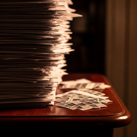 A modern office desk scene featuring neatly stacked paper files and a computer keyboard. Natural light casts soft shadows, creating a professional workspace atmosphere.