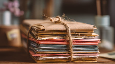 Vintage envelopes stacked neatly, tied with twine, evoke sense of nostalgia and warmth. Perfect for capturing essence of correspondence and personal connections