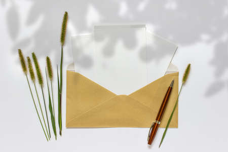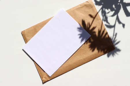 Summer stationery still life with kraft envelope and blank paper card on white background. Hard light, flower shadow. Top view, copy space. Mock-up holiday invitation